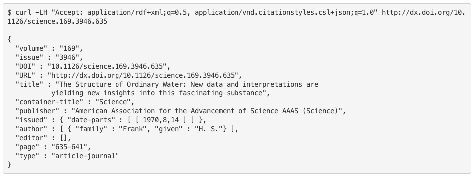 For normal browser requests in which the HTML page header includes GET "Accept: text/html", the DOI name is resolved and the user is redirected to the publisher's landing page URL. For example, the DOI "10.1126/science.169.3946.635" redirects to a landing page describing the article, "The Structure of Ordinary Water". Making a content negotiated request instead requires the use of an HTTP header, "Accept", where the GET includes other known content types that are acceptable to the client (those that it knows how to parse) and that are commonly understood to be a request for linked data. For browser requests for which the header says GET "Accept: application/ref+sml, resolving the same DOI name referenced above will redirect the user to the RA's metadata service. Further, a client that wishes to receive citeproc JSON if it is available, but which can also handle RDF XML if citeproc JSON is unavailable, would make a request with an Accept header listing both "application/citeproc+json" and "application/rdf+xml".